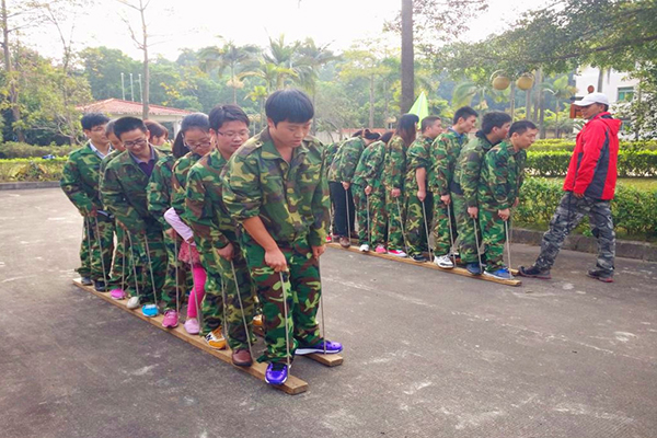 兩隊各分出兩組,每組10位學(xué)員參加比賽,要求學(xué)員左右腳分別站在長條木板上并手握住提繩,全組成員一并行走,同隊另一組學(xué)員